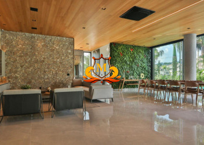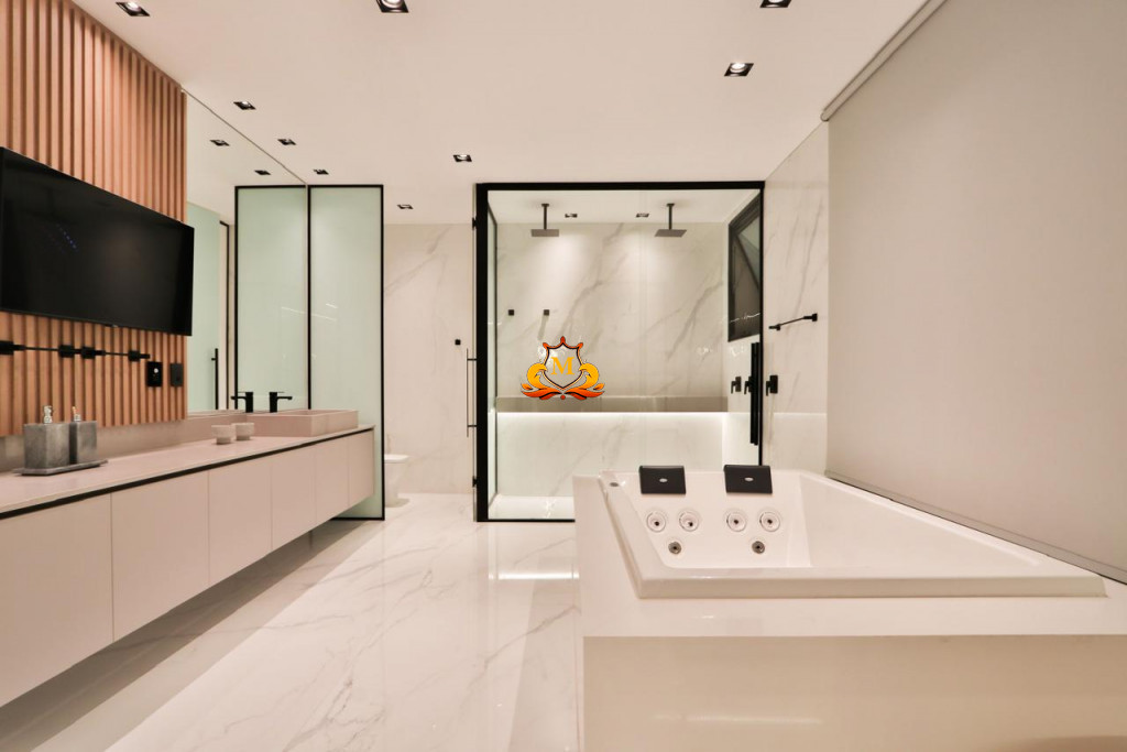 - SPA para 8 pessoas, com cromoterapia, TV e Som integrados, fogo de chão, com vários ambientes de puro relaxamento e lazer, projeto conta com uma fachada única e moderna, com uma Porta Social dupla em ACM medindo 7,40 metros de altura por 4,00 metros de largura, fachada envidraçada com Corzan D’agua e espelho D’água,
