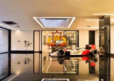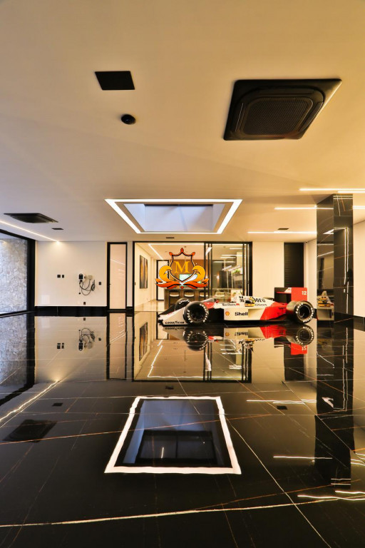 Ampla garagem com 15 vagas, sistema de som integrado, climatizada e automatizada, contendo uma base giratória para exposição de auto e facilitando manobras, com 02 carregadores elétricos veiculares,