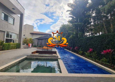 - Piscina retangular interligada ao deck, com SPA, ducha e banheiros de apoio,
