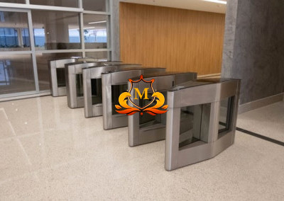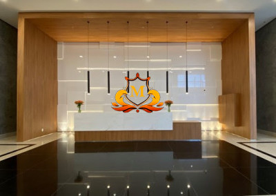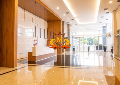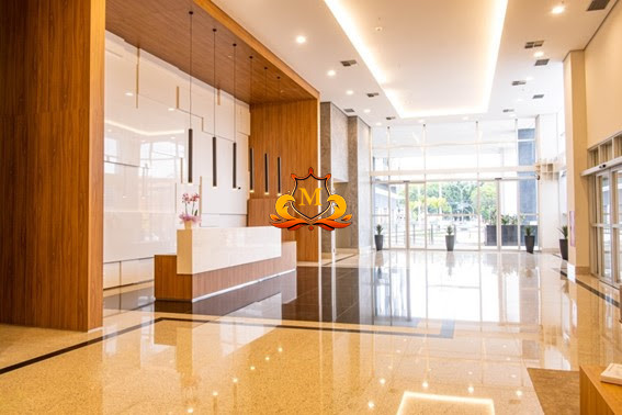 Recepção de entrada (Lobby) com acabamento de alto padrão, pé-direito alto e controles de acesso.