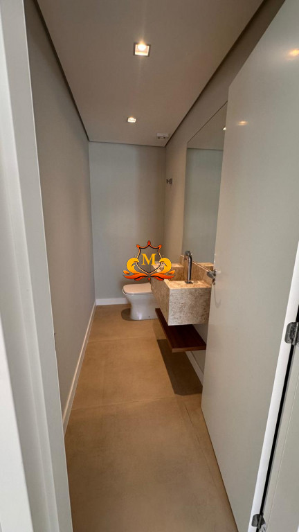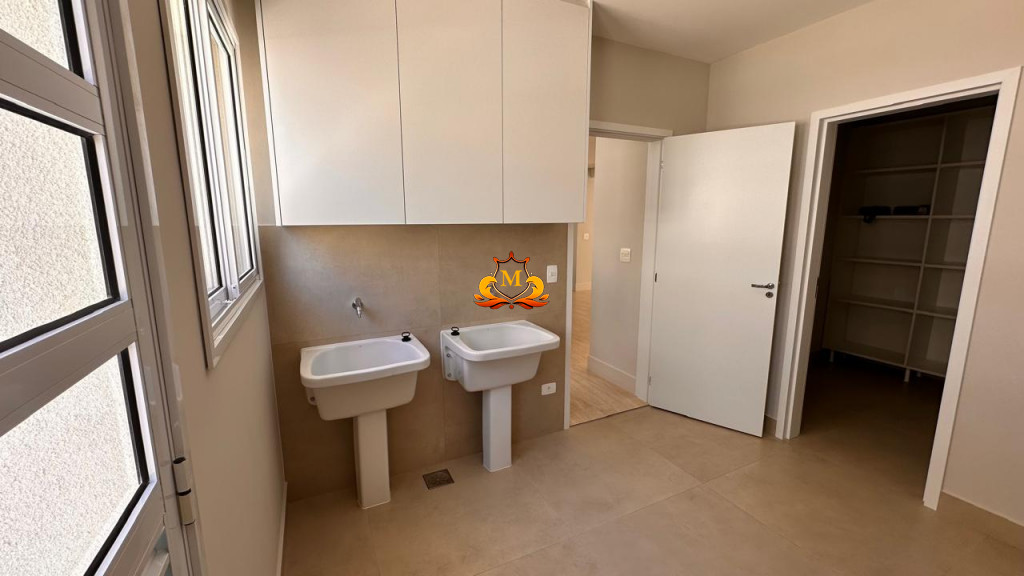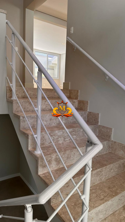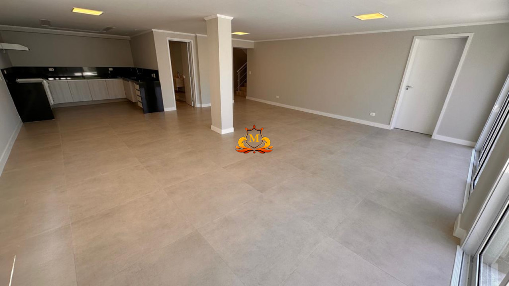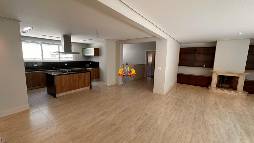 A área social é integrada, com sala de estar e cozinha moderna, além de sala de TV, lavabo e área de serviço, tudo no pavimento térreo.